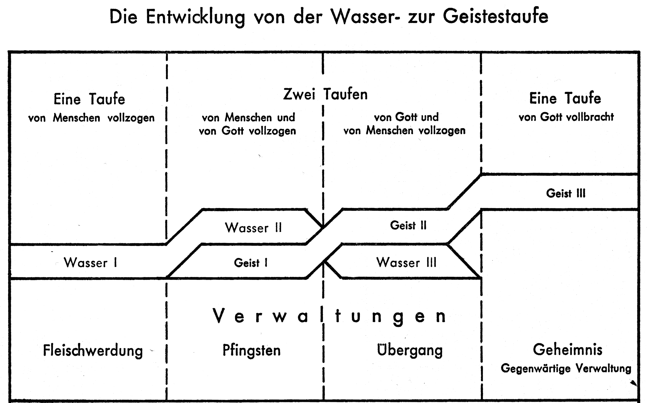 Taufe bedeutet immer eine Trennung und Verbindung gleichzeitig. Die Wassertaufe durch Johannes symbolisierte nach dem öffentlichen Bekenntnis die Trennung von Sünden und dass sich der Täufling mit den Juden verband, die auch eine Königreichserwartung hatten. Die Taufe der Apostel führte in eine Übergangszeit, in der mit Wasser und Geist getauft wurde, wobei sich die Reihenfolge änderte (von Wasser und Geist zu Geist und Wasser) – sie geschah im Namen Jesu, womit man also ein Anhänger Jesu wurde. Letztlich wurde dann realisiert, was schon Jesus selbst angekündigt hat, nämlich, dass gar nicht mehr mit Wasser, sondern nur noch in Geist getauft wurde (Apg. 11,16).